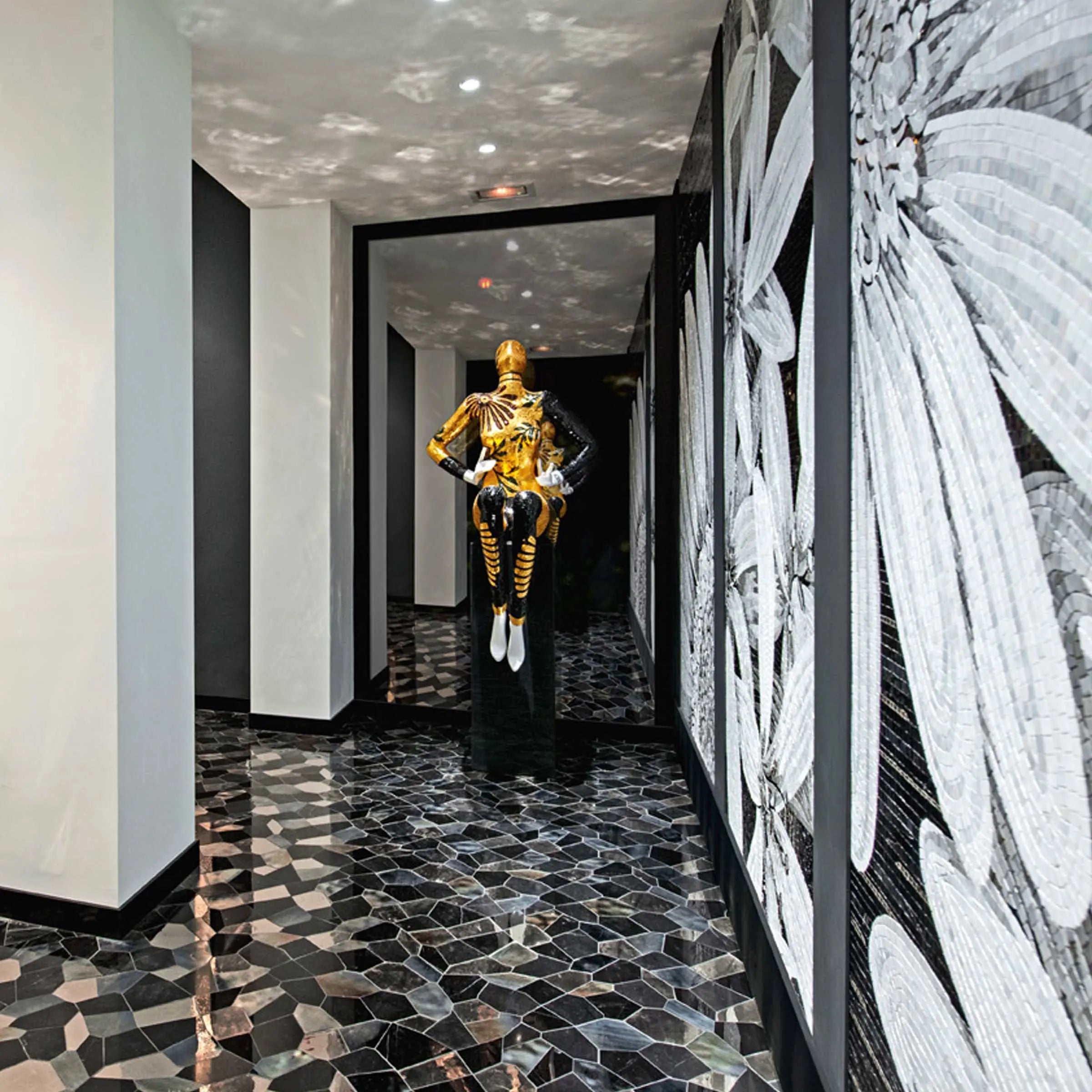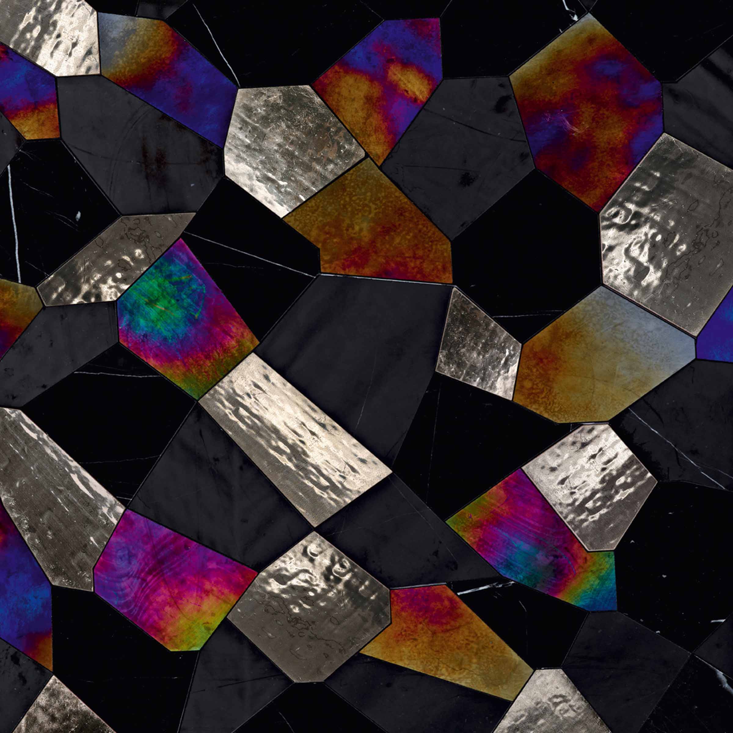 Indulge in the opulence of Italy with Kaleidoscope Platinum Mosaic, built with materials from the esteemed Sicis Stone Collection. This mosaic boasts a stunning blend of marbles and glass tiles.