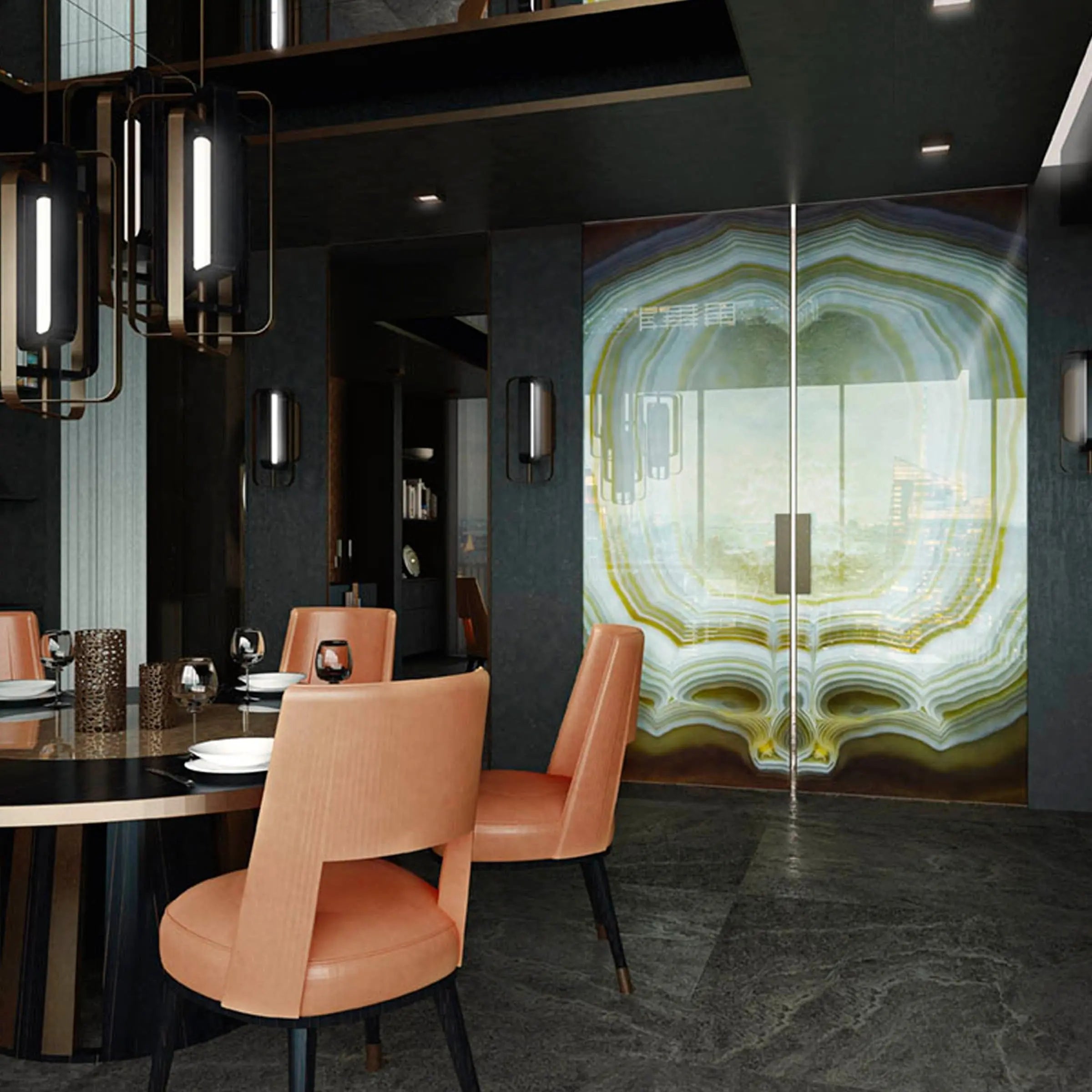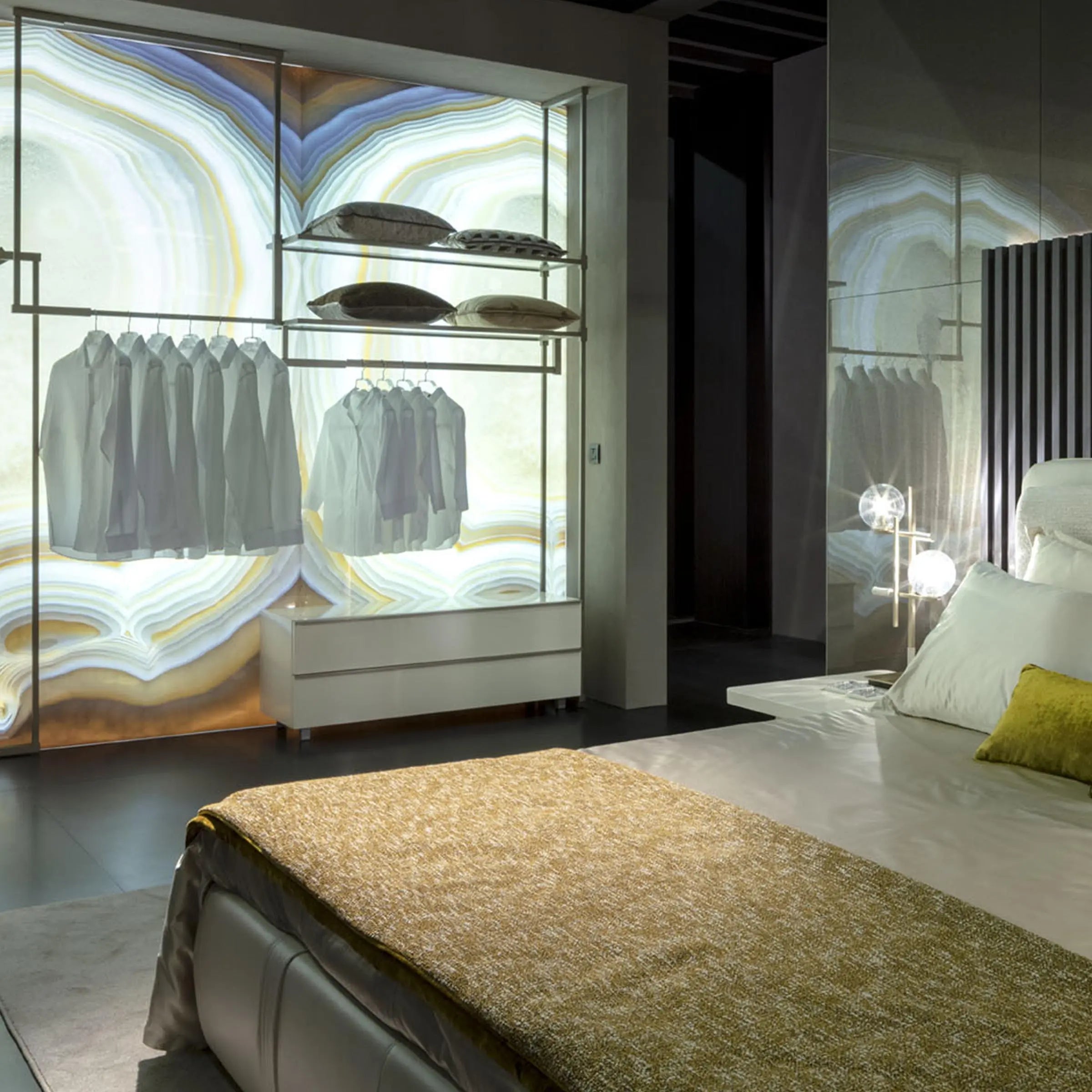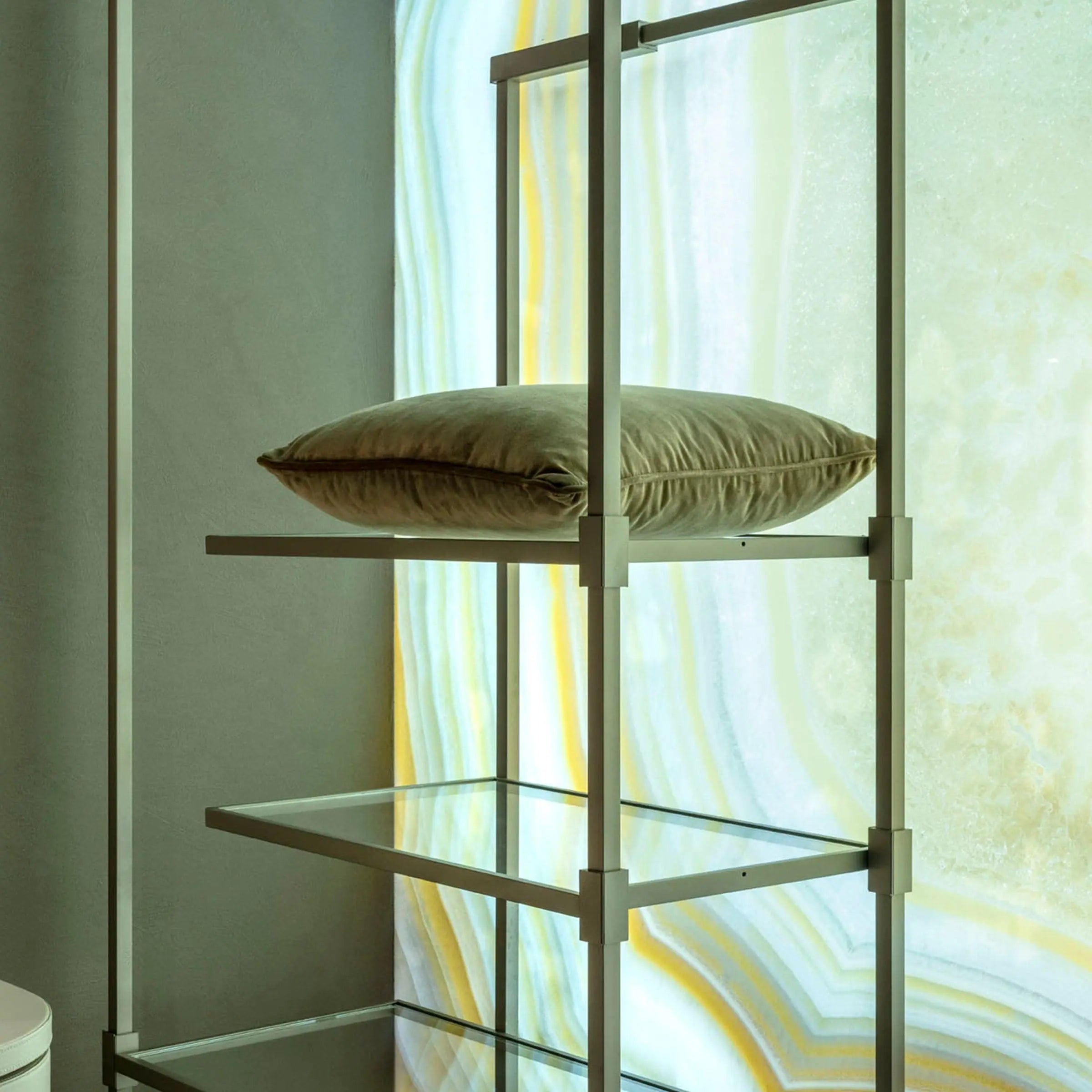 Luxurious AURORA decorative vetrite panel, created by Sicis in Italy. Part of the Gem Glass Collection, this exquisite piece mimics the stunning colors and textures of precious stones and volcanic rocks through a blend of glass, polymers, and metals. Vetrite combines traditional and modern techniques to produce a one-of-a-kind material for interior and exterior surfaces, including bathrooms, kitchens, and outdoor spaces, as well as partitions, facades, and parapets.