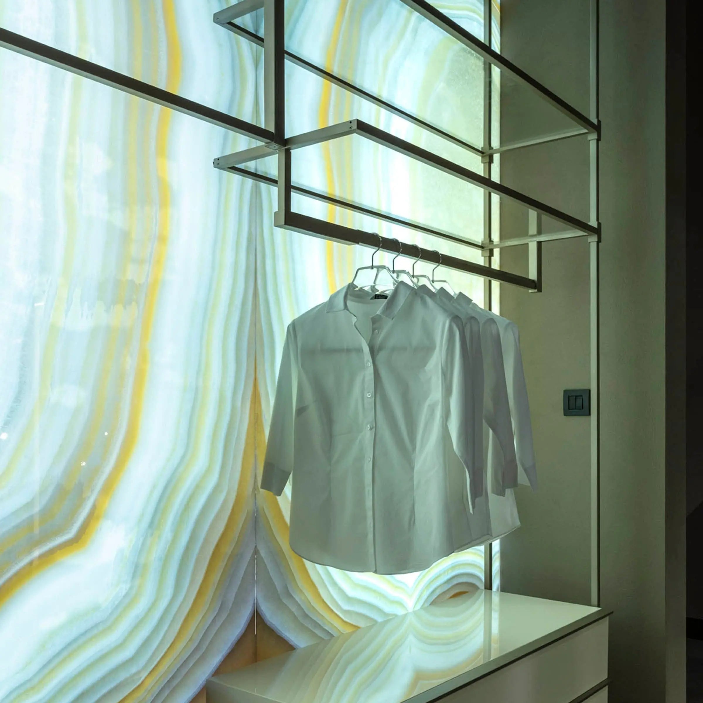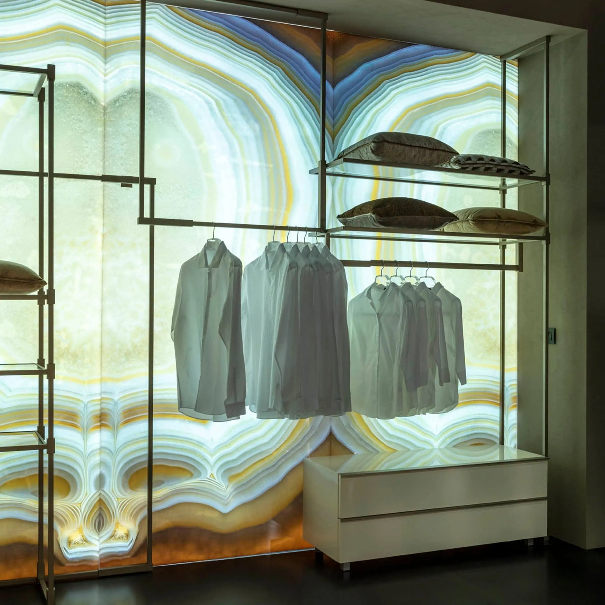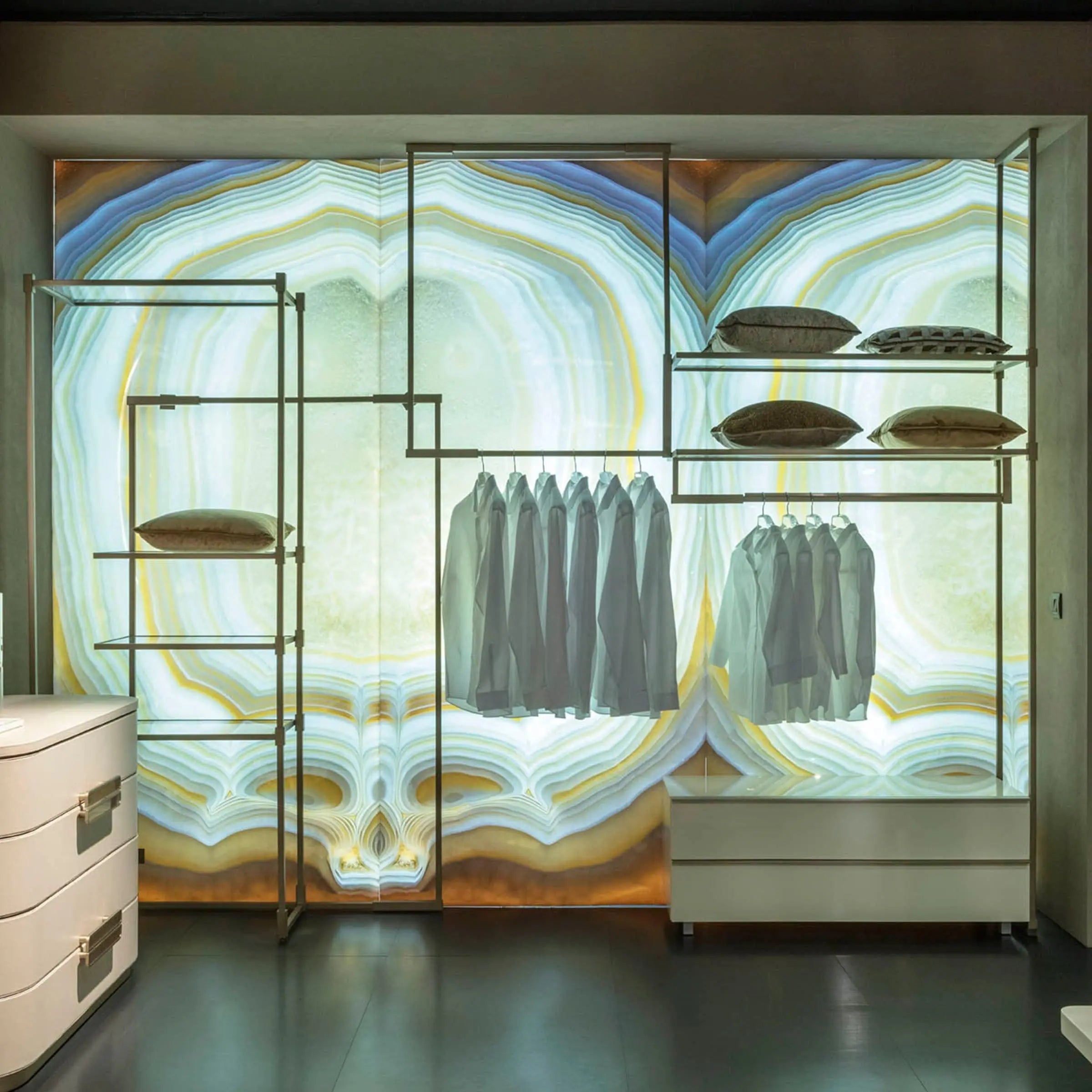 Luxurious AURORA decorative vetrite panel, created by Sicis in Italy. Part of the Gem Glass Collection, this exquisite piece mimics the stunning colors and textures of precious stones and volcanic rocks through a blend of glass, polymers, and metals. Vetrite combines traditional and modern techniques to produce a one-of-a-kind material for interior and exterior surfaces, including bathrooms, kitchens, and outdoor spaces, as well as partitions, facades, and parapets.